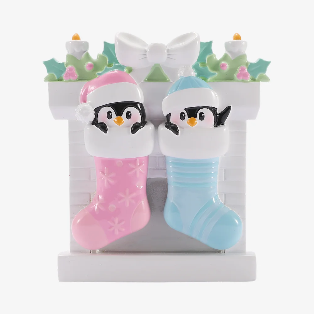 OR3216-A- Baby’s First- Twin Baby Penguins Hanging in Stocking on a Fireplace- Assorted (4 Boys, 4 Girls, 4 Boy and Girl)