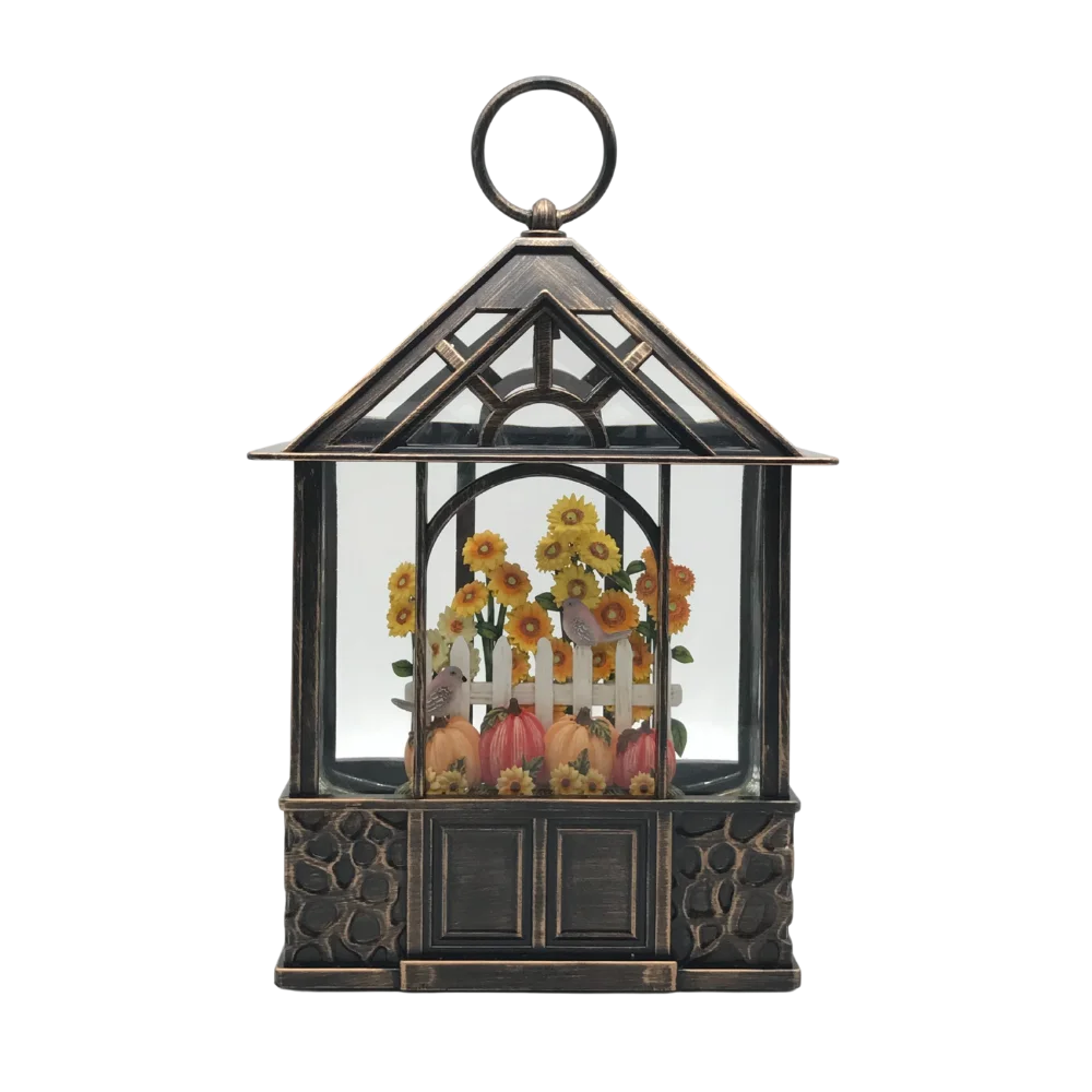 SG23VCP066 Snow Globes- LED Fall Bronze Greenhouse with Pumpkins and Sunflowers Water Lantern